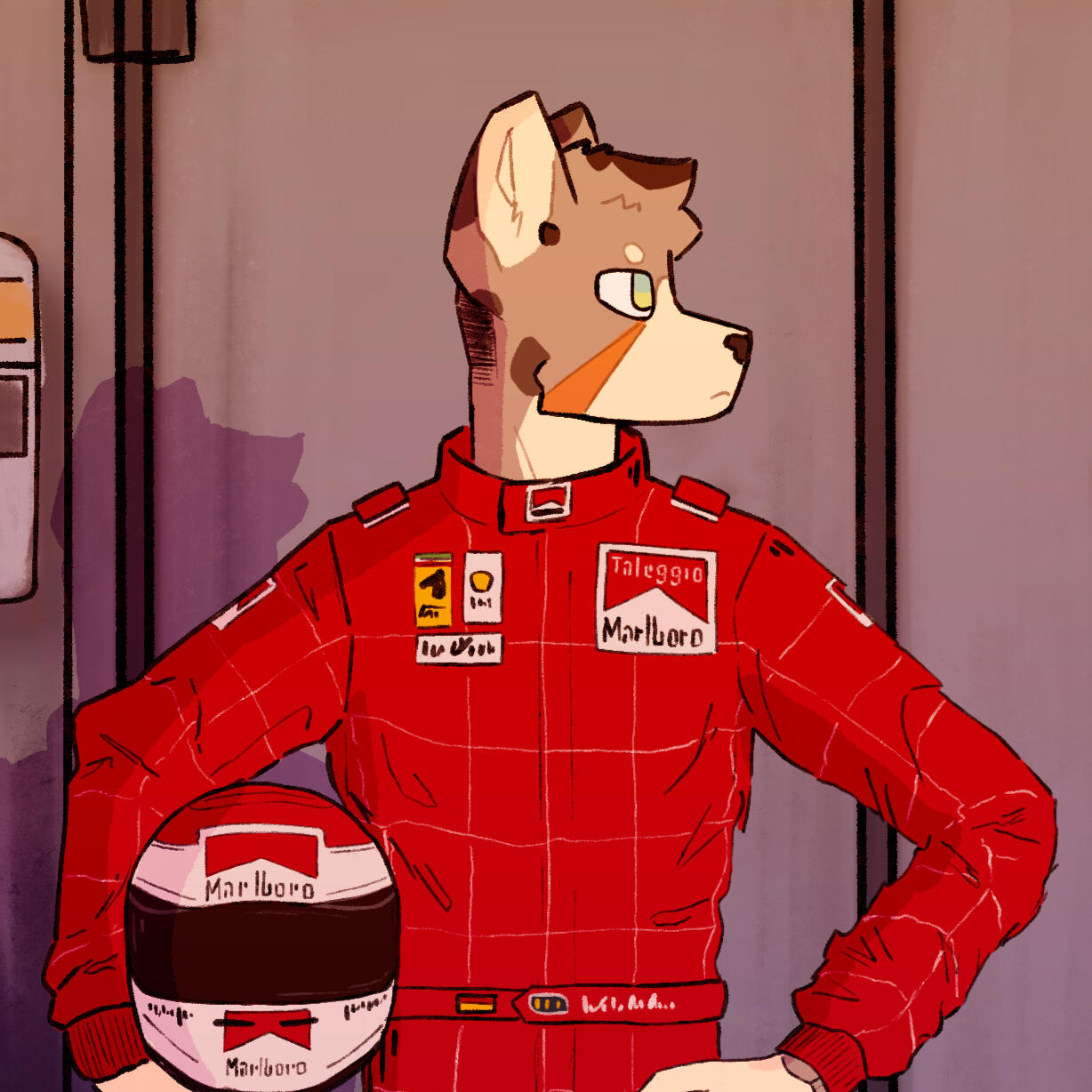 This work depicts the author dressed up as a Formula One driver. The canvas is saturated with detail and realism regarding the historical accuracy and storylines: